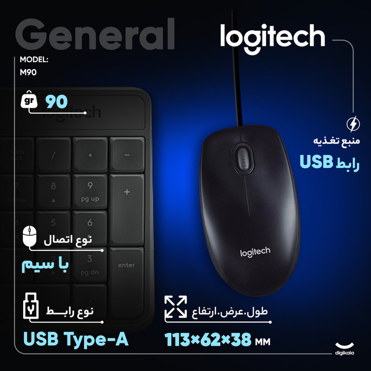 M90 یک ماوس ساده و باسیم است که توسط کمپانی خوشنام «لاجیتک» طراحی و تولید شده است. ماوس لاجیتک M90 از یک حسگر اپتیکال بهره میبرد که قابلیت تشخیص 1000 نقطه در هر اینچ را دارد و عملکردی روان را با کنترل آسان مکاننما و حرکت دقیق برای شما به ارمغان میآورد. طراحی این ماوس به صورتی است که میتوانید با هر دو دست از آن استفاده کنید. به خاطر طراحی ارگونومیک این ماوس، دستان شما بسیار راحت و طبیعی روی آن قرار میگیرند؛ درنتیجه دست شما حتی پس از ساعتها کار طولانی مدت با ماوس خسته نخواهد شد. نصب و استفاده از ماوس لاجیتک M90 بسیار ساده و سریع است و شما برای استفاده از آن به هیچ نرمافزار یا درایوری نیاز نخواهید داشت؛ فقط کافی است کابل ماوس را به پورت USB لپتاپ یا کامپیوتر خود متصل کنید تا بتوانید بلافاصله از آن استفاده کنید. درکل ماوس M90 یک ماوس باسیم، ساده، بسیار روان و خوشدست است که از یک حسگر اپتیکال با دقت 1000dpi بهره میبرد و شما میتوانید با هر دو دست با آن کار کنید؛ همچنین برای مصارف خانگی و استفادهی روزمره بسیار ایدئال است.